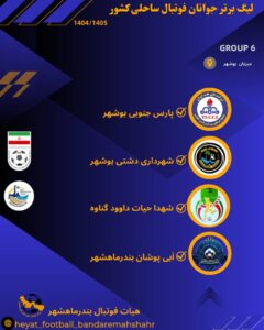 رقابت های لیگ برتر فوتبال ساحلی جوانان کشور در شش گروه قرعه کشی شد و هر گروه به میزبانی یکی از شهرهای مختلف ایران برگزار خواهد شد ، نماینده خوزستان در این رقابت ها آبی پوشان بندرماهشهر خواهد بود