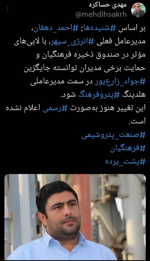 مهدی حساکره فعال رسانه ای در صفحه ایکس خود نوشت: احمد دهقان جای زارع پور در پتروفرهنگ را خواهد گرفت به گزارش ماهشهر۲۴، بر اساس شنیدهها: احمد دهقان، مدیرعامل فعلی انرژی سپهر، با لابیهای مؤثر در صندوق ذخیره فرهنگیان و حمایت برخی مدیران توانسته جایگزین جواد زارعپور در سمت مدیرعاملی هلدینگ پتروفرهنگ شود. این […]